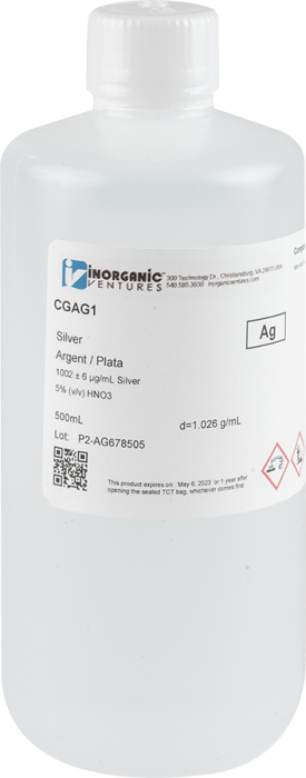 SilverLocation: Group 11, Period 5 Storage & Handling: Keep tightly sealed when not in use. Store and use at 20 ± 4°C. Do not pipet from container. Do not return portions removed for pipetting to container. Chemical Compatibility: Stable in HNO3 and HF. Avoid basic media. Ag forms more insoluble salts than any other metal. It also is subject to photochemical reduction to the metal in HCl media although 10 µg/mL solutions in 10% HCl [AgClx1-x] are commonly used in the analytical laboratory. The most common solubility problems exist with arsenate, arsenite, bromide, chloride, iodide, carbonate, chromate, cyanide, iodate, oxalate, oxide, sulfate, sulfide, tartrate, and thiocyanate in aqueous media. The addition of nitric acid renders many of these salts soluble. Stability: 2-100 ppb levels stable for 75+ days when mixed with equivalent levels of all other elements including the precious metals (where chloride is present) when in 1% HNO3 / LDPE container. 1-10,000 ppm solutions chemically stable for years in 1-5% HNO3 / LDPE container. Ag Containing Samples (Preparation & Solution): Metal (soluble in HNO3); Oxides (soluble in HNO3); Ores (digestion with conc. HNO3). |