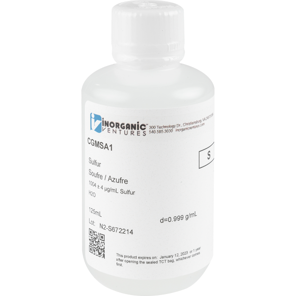SulfurLocation: Group 16, Period 3 Storage & Handling: Keep tightly sealed when not in use. Store and use at 20 ± 4°C. Do not pipet from container. Do not return portions removed for pipetting to container. Chemical Compatibility: Soluble in HCl, HNO3, H3PO4, and HF aqueous matrices, water, and NH4OH. Stable with all metals and inorganic anions at low to moderate ppm levels under acidic conditions, except Ba, Pb, Ca, and to a lesser extent Sr. Stability: 2-100 ppb levels - stability unknown - in 1% HNO3 / LDPE container. 1-10,000 ppm solutions chemically stable for years in LDPE container. S Containing Samples (Preparation & Solution): We most often get questions about the determination of S in rocks, silicates and insoluble sulfates (the finely powered sample is fused in a Pt0 crucible with 6 times its weight of Na2CO3 + 0.5 grams KNO3. The fuseate is extracted with water. Any BaSO4 present in the sample is transposed by the carbonate fusion to the BaCO3, which is left behind in the water-insoluble residue. If PbSO4 is present, the fuseate should be boiled with a sodium carbonate saturated with CO2 solution for 1 hour or more. The PbSO4 will be transposed to the water insoluble carbonate which can be filtered off. Boiling the fuseate with a saturated carbonate solution is good insurance for samples containing Ba, Sr, and Ca. The Ba, Pb, Sr, and Ca free filtrate can be acidified and measured by ICP). |