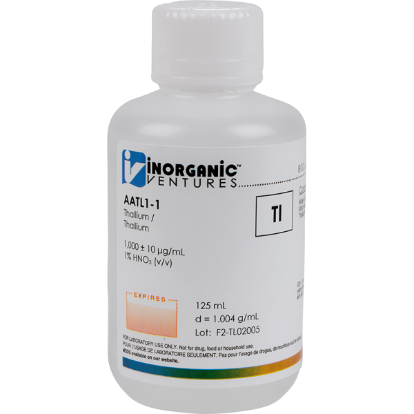 ThalliumLocation: Group 13, Period 6 Storage & Handling: Keep tightly sealed when not in use. Store and use at 20 ± 4°C. Do not pipet from container. Do not return portions removed for pipetting to container. Chemical Compatibility: Soluble in HCl, HNO3, and H2SO4. Stable with most metals and inorganic anions. The sulfite, thiocyanate, and oxalate are moderately soluble; the phosphate and arsenite are slightly soluble and the sulfide is insoluble. Stability: 2-100 ppb levels stable for months in 1% HNO3 / LDPE container. 1-10,000 ppm solutions chemically stable for years in 2-5% HNO3 / LDPE container. Tl Containing Samples (Preparation & Solution): Metal (is best dissolved in HNO3 which forms chiefly the Tl1+ ion); Oxide (the thallous oxide is readily soluble in water. The thallic oxide requires high levels of acid); Ores (carbonate fusion in Pt0 followed by HCl dissolution); Organic Matrices (Sulphuric / peroxide digestion or dry ash and dissolution in HCl). |