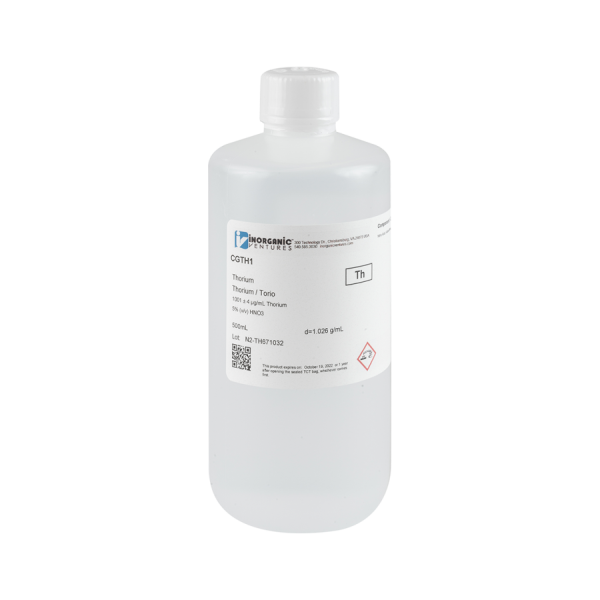 ThoriumLocation: Period 7 (actinoid) Storage & Handling: Keep tightly sealed when not in use. Store and use at 20 ± 4°C. Do not pipet from container. Do not return portions removed for pipetting to container. Chemical Compatibility: Soluble in HCl and HNO3. Avoid H3PO4, H2SO4, and HF, although solubilities may not be a problem depending upon pH and matrix (i.e. - ThF4 is soluble in acids). Avoid neutral to basic media. Th4+ is stable with most metals and inorganic anions forming an insoluble carbonate, oxide, fluoride, oxalate, sulfate, and phosphate in neutral to slightly acidic media. Stability: 2-100 ppb levels stable for months in 1% HNO3 / LDPE container. 1-10,000 ppm solutions chemically stable for years in 2-5% HNO3 / LDPE container. Th Containing Samples (Preparation & Solution): Metal (soluble in aqua regia); Oxide (the heated oxide is not soluble in acids except hot conc. H2SO4); Ores (Na2O2 fusion at 480 ± 20°C for 7 minutes, cool, and treat sintered mass with 50 mL cold water and let stand until disintegrated. The mass is transferred to a beaker and acidified with HCl, with 25 mL excess HCl added. Any residue is collected on a Whatman No. 42 filter, dried and ignited to 1000°C in Pt0 crucible and ash treated with H2SO4 / HF and fumed. If residue remains, then treat it by peroxide fusion as described above). |