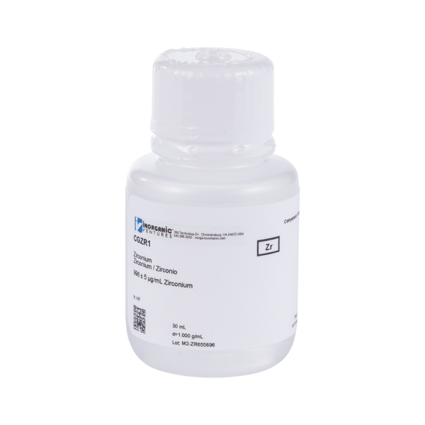 ZirconiumLocation: Group 4, Period 5 Storage & Handling: Keep tightly sealed when not in use. Store and use at 20 ± 4°C. Do not pipet from container. Do not return portions removed for pipetting to container. Chemical Compatibility: Soluble in concentrated HCl, HF, H2SO4 (very hot) and HNO3. Avoid H3PO4 and neutral to basic media. Unstable at ppm levels with metals that would pull F- away (i.e. - do not mix with Alkaline or Rare Earths or high levels of transition elements unless they are fluorinated). Stable with most inorganic anions but precipitation with phosphate, oxalate, and tartrate with a tendency to hydrolyze forming the hydrated oxide in all dilute acids except HF. Stability: 2-100 ppb levels stable (alone or mixed with all other metals that are at comparable levels) as the Zr(F)6-2 + Zr(OH)4F2-2 for months in 1% HNO3 / LDPE container. 1-10,000 ppm single element solutions as the Zr(F)6-2 chemically stable for years in 2-5% HNO3 / trace HF in an LDPE container. Zr Containing Samples (Preparation & Solution): Metal (soluble in H2O / HF / HNO3); Oxide unlike TiO2, the ZrO2 is best fused in one of the following ways (Na2O2 in Ni0, Na2CO3 in Pt0 or Borax in Pt0); Organic Matrices (dry ash at 450°C in Pt0 and dissolve by fusing with Na2CO3 and dissolving in HF / HNO3 / H2O). |
