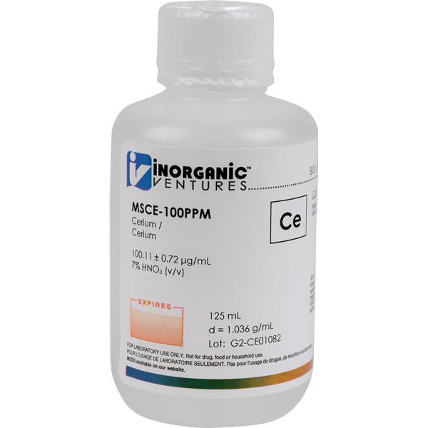 CeriumLocation: Period 6 (lanthanoid) Intended Use: For the calibration of analytical instruments and validation of analytical methods as appropriate.Storage & Handling: Keep tightly sealed when not in use. Store and use at 20 ± 4°C. Do not pipet from container. Do not return portions removed for pipetting to container. Chemical Compatibility: Soluble in HCl and HNO3. Avoid HF, H3PO4, H2SO4 and neutral to basic media. Stable with most metals and inorganic anions forming an insoluble carbonate, oxide, oxalate, and fluoride and sparingly soluble sulfates (La - Eu exhibit low sulfate solubility). Avoid mixing with elements / solutions containing moderate amounts of fluoride. Stability: 2-100 ppb levels stable for months in 1% HNO3 / LDPE container. 1-10,000 ppm solutions chemically stable for years in 2-5 % HNO3 / LDPE container. Ce Containing Samples (Preparation & Solution): Metal (soluble in acids); Oxide (dissolved by heating in H2O / HNO3); Ores (carbonate fusion in Pt0 followed by HCl dissolution); Organic Matrices (dry ash and dissolve in 1:1 H2O / HCl or HNO3). |
