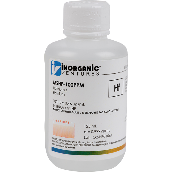 HafniumLocation: Group 4, Period 6 Storage & Handling: Keep tightly sealed when not in use. Store and use at 20 ± 4°C. Do not pipet from container. Do not return portions removed for pipetting to container. Chemical Compatibility: Soluble in concentrated HCl, HF, H2SO4 (very hot), and HNO3. Avoid H3PO4and neutral to basic media. Unstable at ppm levels with metals that would pull F- away (i.e. - do not mix with Alkaline or Rare Earths or high levels of transition elements unless they are fluorinated). Stable with most inorganic anions but precipitation with phosphate, oxalate, and tartrate with a tendency to hydrolyze forming the hydrated oxide in all dilute acids except HF. Stability: 2-100 ppb levels stable alone or mixed with all other metals that are at comparable levels as the Hf(F)6-2 + Hf(OH)4F2-2 for months in 1% HNO3 / LDPE container. 1-10,000 ppm single element solutions as the Hf(F)6-2 chemically stable for years in 2-5% HNO3 / trace HF in an LDPE container. Hf Containing Samples (Preparation & Solution): Metal (soluble in H2O / HF / HNO3); Oxide - unlike TiO2 the HfO2 is best fused in one of the following ways (Na2O2 in Ni0, Na2CO3 in Pt0 or Borax in Pt0); Organic Matrices (dry ash at 450°C in Pt0 and dissolve by fusing with Na2CO3 and dissolving in HF / HNO3 / H2O). |