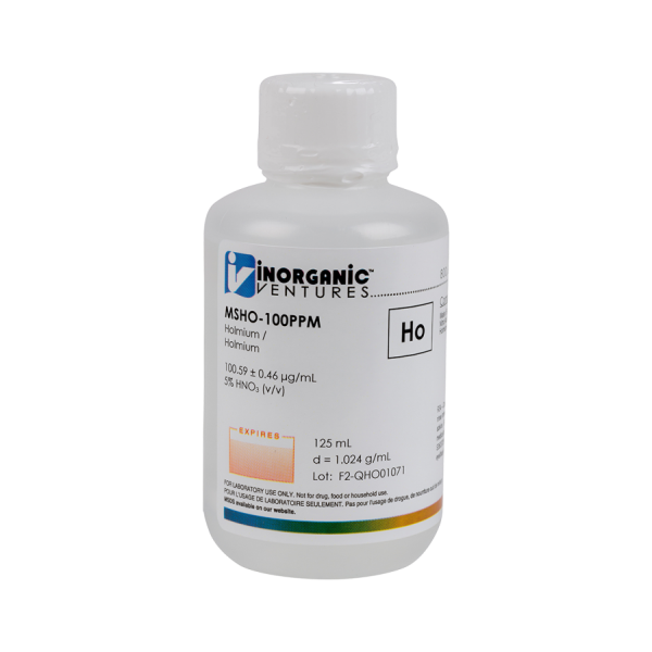 HolmiumLocation: Period 6 (lanthanoid) Storage & Handling: Keep tightly sealed when not in use. Store and use at 20 ± 4°C. Do not pipet from container. Do not return portions removed for pipetting to container. Chemical Compatibility: Soluble in HCl, H2SO4, and HNO3. Avoid HF, H3PO4, and neutral to basic media. Stable with most metals and inorganic anions forming an insoluble carbonate, oxide, oxalate, and fluoride. Avoid mixing with elements / solutions containing moderate amounts of fluoride. Stability: 2-100 ppb levels stable for months in 1% HNO3 / LDPE container. 1-10,000 ppm solutions chemically stable for years in 2-5% HNO3 / LDPE container. Ho Containing Samples (Preparation & Solution): Metal (soluble in acids); Oxide (dissolved by heating in H2O / HNO3); Ores (carbonate fusion in Pt0 followed by HCl dissolution); Organic Matrices (dry ash and dissolve in 1:1 H2O / HCl or HNO3). |
