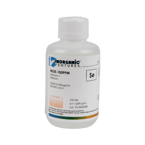 SeleniumLocation: Group 16, Period 4 Storage & Handling: Keep tightly sealed when not in use. Store and use at 20 ± 4°C. Do not pipet from container. Do not return portions removed for pipetting to container. Chemical Compatibility: Soluble in HCl, HNO3, H3PO4, H2SO4 and HF aqueous matrices and water. It is stable with most inorganic anions but many cationic metals form the insoluble selenites under pH neutral conditions. When fluorinated and/or under acidic conditions precipitation is typically not a problem at moderate to low concentrations. Stability: 2-100 ppb levels stable for months alone or mixed with other elements at equivalent levels in 1 % HNO3 / LDPE container. 1-10,000 ppm solutions chemically stable for years in 1-5% HNO3 / LDPE container. Se Containing Samples (Preparation & Solution): Metal (soluble in HNO3); Oxides (readily soluble in water); Minerals and alloys (acid digestion with HNO3or HNO3 / HF); Organic Matrices (acid digestion with hot concentrated H2SO4 accompanied by the careful dropwise addition of H2O2 until clear). |