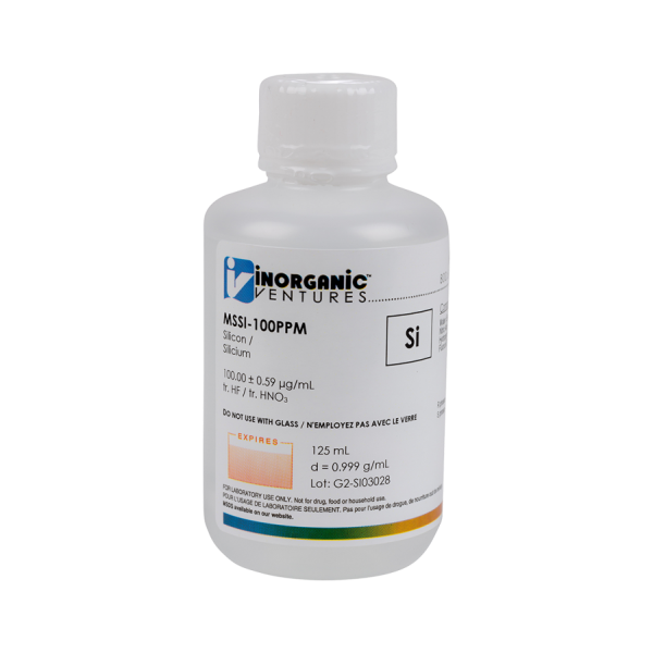SiliconLocation: Group 14, Period 3 Storage & Handling: Keep tightly sealed when not in use. Store and use at 20 ± 4°C. Do not pipet from container. Do not return portions removed for pipetting to container. Chemical Compatibility: Soluble in HCl, HF, H3PO4, H2SO4, and HNO3 as the Si(OH)x(F)y2-. Avoid neutral to basic media. Unstable at ppm levels with metals that would pull F- away (i.e. - do not mix with Alkaline or Rare Earths, or high levels of transition elements unless they are fluorinated). Stable with most inorganic anions with a tendency to hydrolyze forming silicic acid (silicic acid is soluble up to ~ 100 ppm in water) in all dilute acids except HF. Stability: 2-100 ppb levels - stability unknown - (alone or mixed with all other metals) as the Si(OH)x(F)y2-. 1-10,000 ppm single element solutions as the Si(OH)x(F)y2- chemically stable for years in 2-5% HNO3 / trace HF in a LDPE container. Si Containing Samples (Preparation & Solution): Metal (soluble in 1:1:1 H2O / HF / HNO3); Oxide - SiO2, amorphic (dissolve by heating in 1:1:1 H2O / HF / HNO3); Oxide-quartz (fuse in Pt0 with Na2CO3); Geological Samples (fuse in Pt0 with Na2CO3 followed by HCl solution of the fuseate); Organic Matrices containing silicates and non volatile silicon compounds (dry ash at 450°C in Pt0 and dissolve by gently warming with 1:1:1 H2O / HF / H2SO4 or fuse / ash with Na2CO3 and dissolve fuseate with HCl / H2O); Silicone Oils - dimethyl silicones depolymerize to form volatile monomer units when heated (measure directly in alcoholic KOH / xylene mixture where sample is treated first with the KOH at 60 - 100°C to "unzip" the Si-O-Si polymeric structure or digest with conc. H2SO4 / H2O2 followed by cooling and dissolution of the dehydrated silica with HF). Note that the direct analysis of silicone oils in an organic solvent will result in false high results due to high vapor pressure of volatile monomer units such as hexamethylcyclotrisiloxane. The KOH forms the K2+Si(CH3)2O=NaCl, which is not volatile at room temperature. |