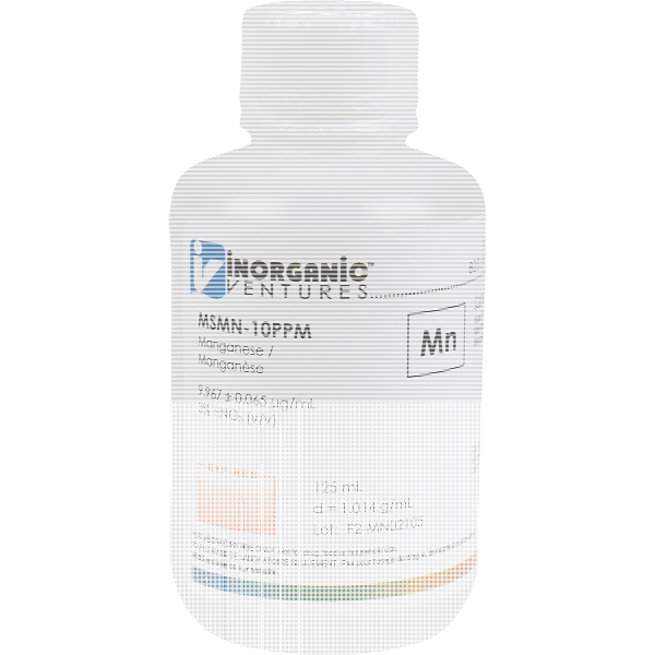 ManganeseLocation: Group 7, Period 4 Intended Use: For the calibration of analytical instruments and validation of analytical methods as appropriate.Storage & Handling: Keep tightly sealed when not in use. Store and use at 20 ± 4°C. Do not pipet from container. Do not return portions removed for pipetting to container. Chemical Compatibility: Stable in HCl, HNO3, H2SO4, HF, and H3PO4. Avoid basic media. Stable with most metals and inorganic anions in acidic media. Stability: 2-100 ppb levels stable for months in 1% HNO3 / LDPE container. 1-10,000 ppm solutions chemically stable for years in 1-5 % HNO3 / LDPE container. Mn Containing Samples (Preparation & Solution): Metal (soluble in dilute acids); Oxides (soluble in dilute acids); Ores (dissolve with HCl. If silica is present, add HF and then fume off silica by adding H2SO4 and heat to SO3 fumes - dense white fumes). |