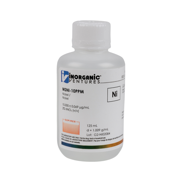 NickelLocation: Group 10, Period 4 Intended Use: For the calibration of analytical instruments and validation of analytical methods as appropriate.Storage & Handling: Keep tightly sealed when not in use. Store and use at 20 ± 4°C. Do not pipet from container. Do not return portions removed for pipetting to container. Chemical Compatibility: Stable in HCl, HNO3, H2SO4, HF, and H3PO4. Avoid basic media. Stable with most metals and inorganic anions in acidic media. Stability: 2-100 ppb levels. 2-100 ppb levels stable for months in 1% HNO3 / LDPE container. 1-10,000 ppm solutions chemically stable for years in 1-5% HNO3 / LDPE container. Ni Containing Samples (Preparation & Solution): Metal (soluble in HNO3); Oxides (soluble in HCl); Ores (dissolve in HCl / HNO3). |