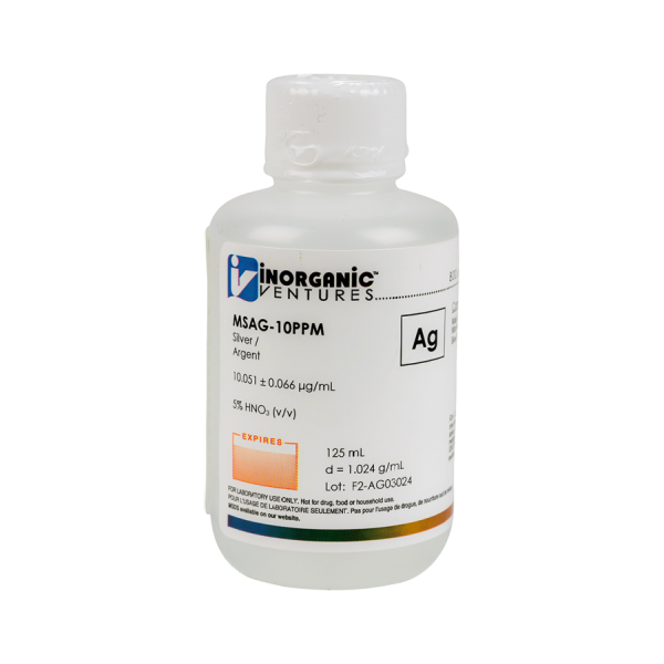 SilverLocation: Group 11, Period 5 Intended Use: For the calibration of analytical instruments and validation of analytical methods as appropriate.Storage & Handling: Keep tightly sealed when not in use. Store and use at 20 ± 4°C. Do not pipet from container. Do not return portions removed for pipetting to container. Chemical Compatibility: Stable in HNO3 and HF. Avoid basic media. Ag forms more insoluble salts than any other metal. It also is subject to photochemical reduction to the metal in HCl media although 10 µg/mL solutions in 10% HCl [AgClx1-x] are commonly used in the analytical laboratory. The most common solubility problems exist with arsenate, arsenite, bromide, chloride, iodide, carbonate, chromate, cyanide, iodate, oxalate, oxide, sulfate, sulfide, tartrate, and thiocyanate in aqueous media. The addition of nitric acid renders many of these salts soluble. Stability: 2-100 ppb levels stable for 75+ days when mixed with equivalent levels of all other elements including the precious metals (where chloride is present) when in 1% HNO3 / LDPE container. 1-10,000 ppm solutions chemically stable for years in 1-5% HNO3 / LDPE container. Ag Containing Samples (Preparation & Solution): Metal (soluble in HNO3); Oxides (soluble in HNO3); Ores (digestion with conc. HNO3). |
