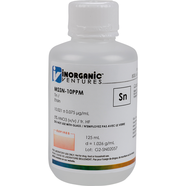 TinLocation: Group 14, Period 5 Intended Use: For the calibration of analytical instruments and validation of analytical methods as appropriate. Storage & Handling: Keep tightly sealed when not in use. Store and use at 20 ± 4°C. Do not pipet from container. Do not return portions removed for pipetting to container. Chemical Compatibility: Soluble in HCl and dilute HF / HNO3. Avoid neutral to basic media. Unstable at ppm levels with metals that would pull F- away (i.e. - do not mix with Alkaline or Rare Earths or high levels of transition elements unless they are fluorinated). Stable with most inorganic anions, provided it is in the chemical form shown above. Stability: 2-100 ppb levels stable (alone or mixed with all other metals that are at comparable levels) as the Sn(OH)xFy2- for 1 year in 1% HNO3 / LDPE container. 1-10,000 ppm single element solutions as the Sn(OH)xFy2- are chemically stable for years in 2-5% HNO3 / trace HF in a LDPE container. Sn Containing Samples (Preparation & Solution): Metal (soluble in HF / HNO3 or HCl); Oxides - SnO (soluble in HCl), SnO2 - very resistant to all acids including HF (fusion with equal parts of Na2CO3 and S is soluble in water or dilute acids as the thiostannate); Alloys (treat first 0.1 g with 10 mL conc. H2SO4 to boiling until the alloy disintegrates and nearly all of the Sulphuric acid is expelled. Then add 100 mL O2 free water and 50 mL of conc HCl or transfer to a plastic container and add 1 mL HF, in either case, warming gently to bring about solution); Organic Matrices (volatility and precipitation of the insoluble stannic oxide are problems -- because these preparations are prone to error, we recommend you contact our technical staff at sales@esslab.com or tel:01702 555577 and we'll provide you with the necessary data for your specific sample type). |