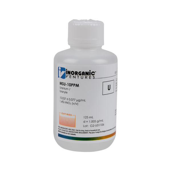 UraniumLocation: Period 7 (actinoid) Intended Use: For the calibration of analytical instruments and validation of analytical methods as appropriate. Storage & Handling: Keep tightly sealed when not in use. Store and use at 20 ± 4°C. Do not pipet from container. Do not return portions removed for pipetting to container. Chemical Compatibility: Soluble in HCl and HNO3. Avoid H3PO4. H2SO4 and HF matrices should not be a problem depending upon [U]. Although the UO22+ ion is distinctly basic, any U+4 will ppt. in basic media. UO22+salts are generally soluble in water and UO22+ is stable with most metals and inorganic anions. The uranyl phosphate is insoluble in water. UF4 and UF6 are water soluble. Stability: 2-100 ppb levels stable for months in 1% HNO3 / LDPE container. 1-10,000 ppm solutions chemically stable for years in 2-5% HNO3 / LDPE container. U Containing Samples (Preparation & Solution): Metal (dissolves rapidly in HCl and HNO3); Oxide (soluble in HNO3); Ores (digest for 1-2 hours with 1 gram of ore to 30 mL 1:1 HNO3. Silica insolubles are removed by filtration after bringing the sample to fumes with conc. H2SO4). |