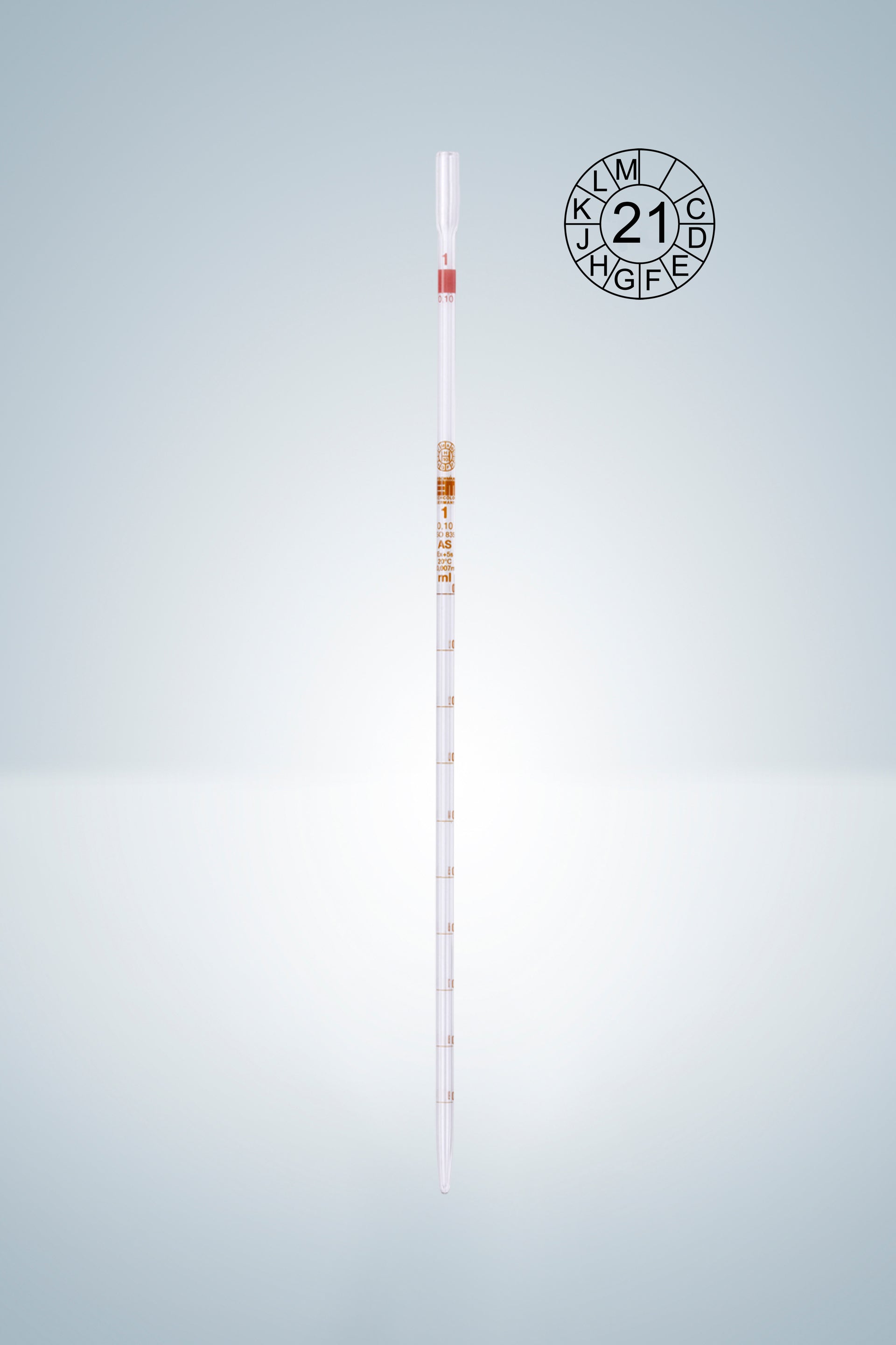 Graduated pipettes, class AS, amber stain graduation, 2:0,02 ml, with mouth piece for cotton plug, main point ring graduation, graduated to tip, zero on top, type 3, with declaration of conformity acc. to DIN 12600, with dated batch identification, acc. to DIN EN ISO 835.