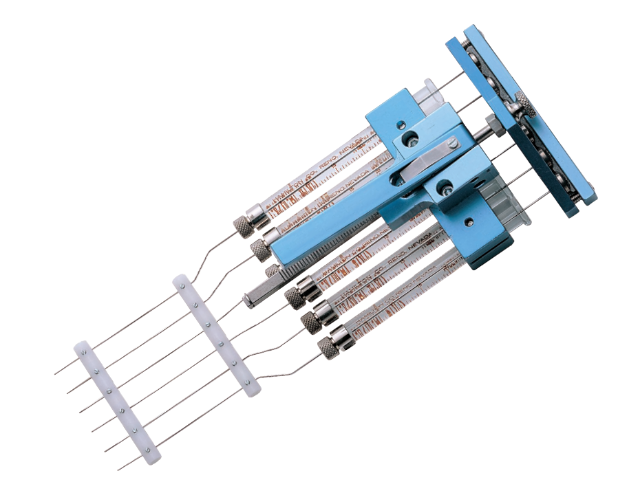Multi-syringe dispenser for accurate dispensing of six samples simultaneously up to 50 times (1/50th of syringe nominal volume) with the press of a lever.