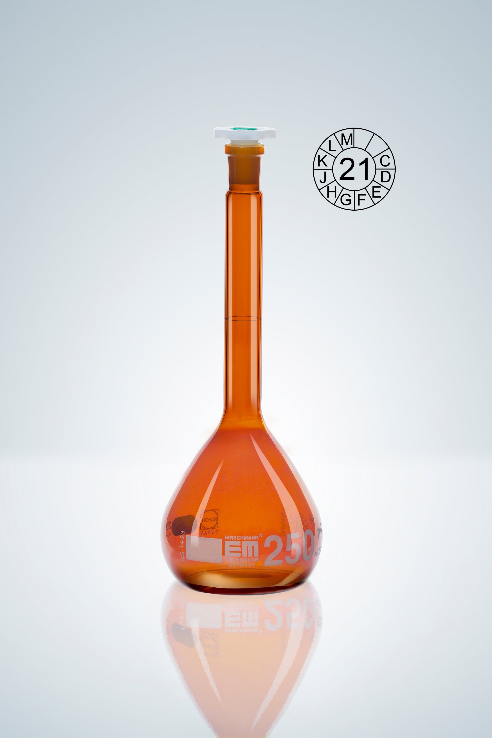 Volumetric flasks DURAN®, class A, amber glass, 100:0,1 ml, NS 12/21, H 170 mm, with NS ground and Polyethylene stopper, with declaration of conformity acc. to DIN 12600, with dated batch identification, acc. to DIN EN ISO 1042.
