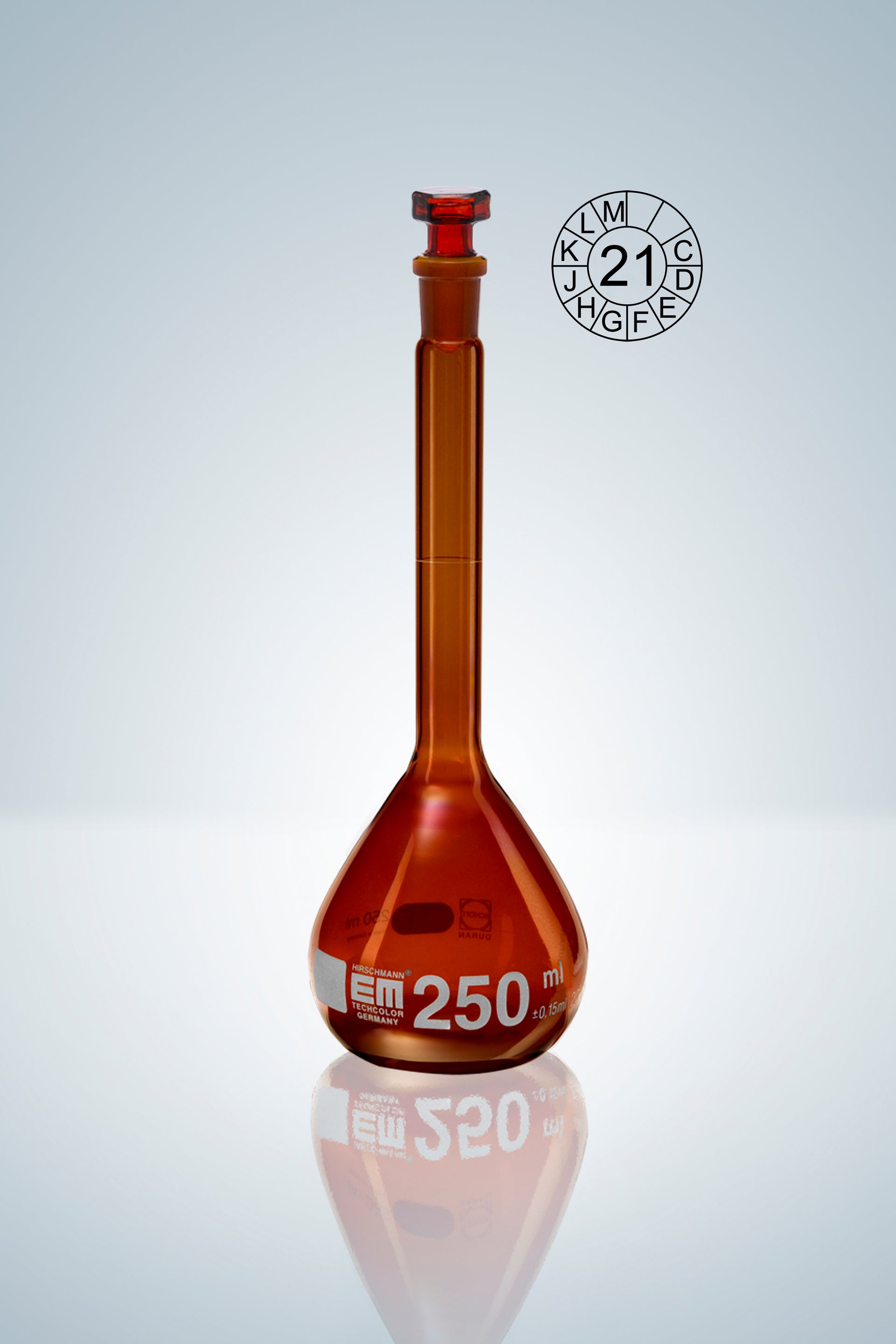Volumetric flasks DURAN®, class A, amber glass, 100:0,1 ml, NS 12/21, H 170 mm, with NS ground and hollow brown glass stopper, with declaration of conformity acc. to DIN 12600, with dated batch identification, acc. to DIN EN ISO 1042.