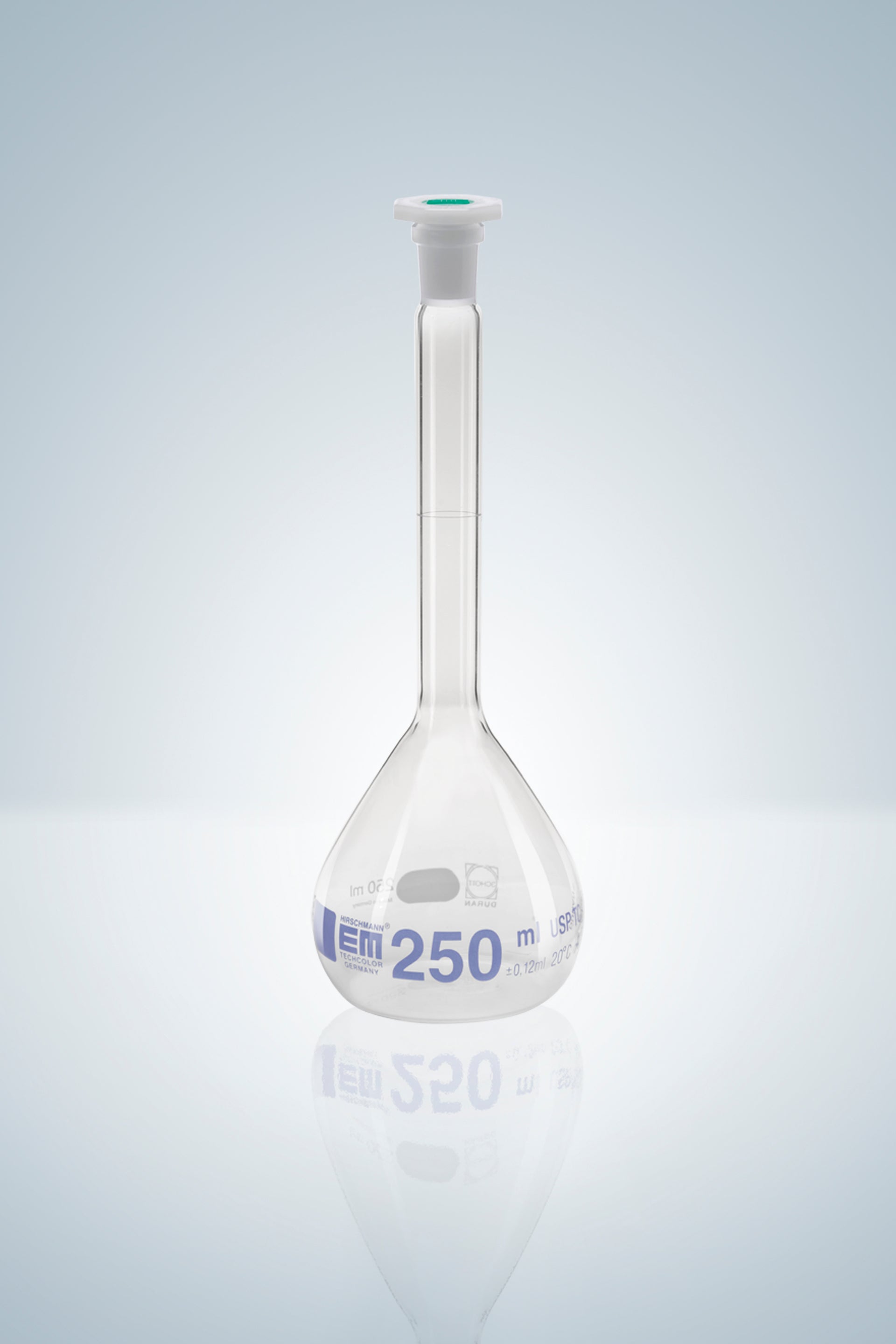Volumetric flask DURAN®, class A, USP, blue graduation, 50:0,5 ml, NS 12/21, H 140 mm, with NS ground and Polyethylene stopper. With dated batch indentification for free (www.hirschmannlab.de/Services/Calibration certificate). USP certificate available (Code-No. 9980104).