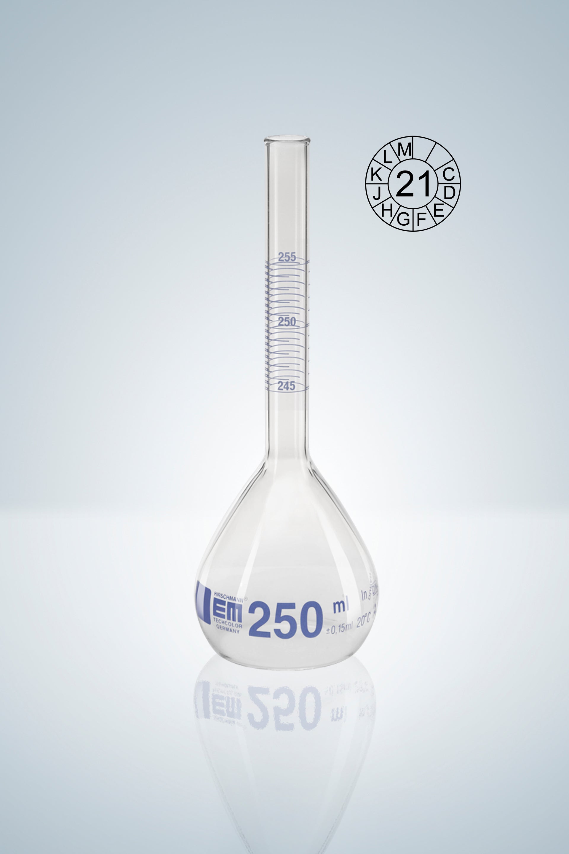 Volumetric flasks DURAN®, blue graduation, 330:0,5 ml, H 240 mm, in conjunction with the prePacking regulations, with rim, with declaration of conformity acc. to DIN 12600, with dated batch identification.