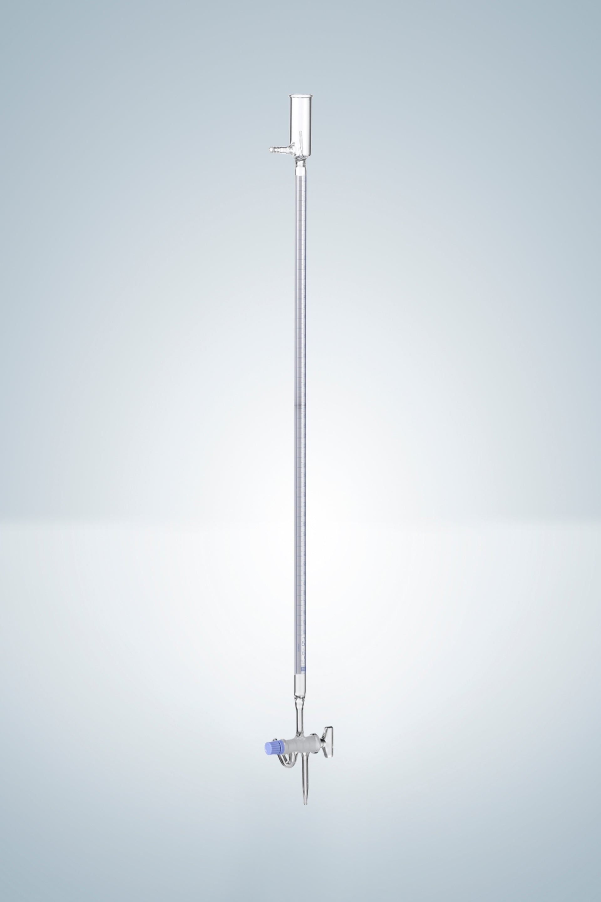 Dafter-burettes DURAN®, blue graduation, 50:0,1 ml, three-way stopcock with glass key, straight form, Schellbach, short line.