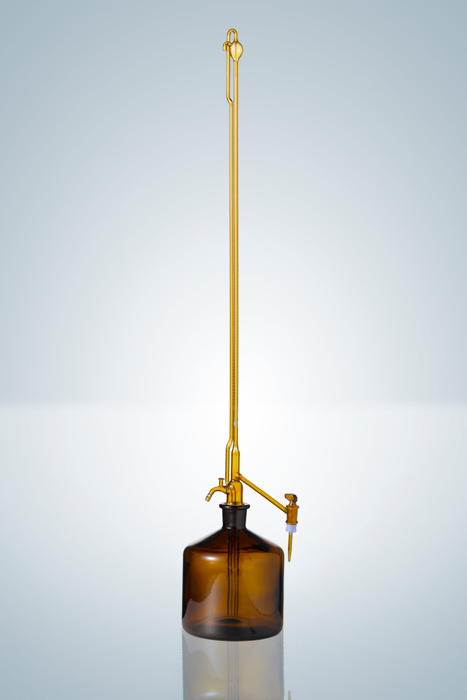 Automatic burettes DURAN®, class B white graduation, 25:0,05 ml, incl. 2000 ml bottle (amber glass), Pellet, short line, lateral glass stopcock, without intermediate stopcock, acc. to DIN EN ISO 385.