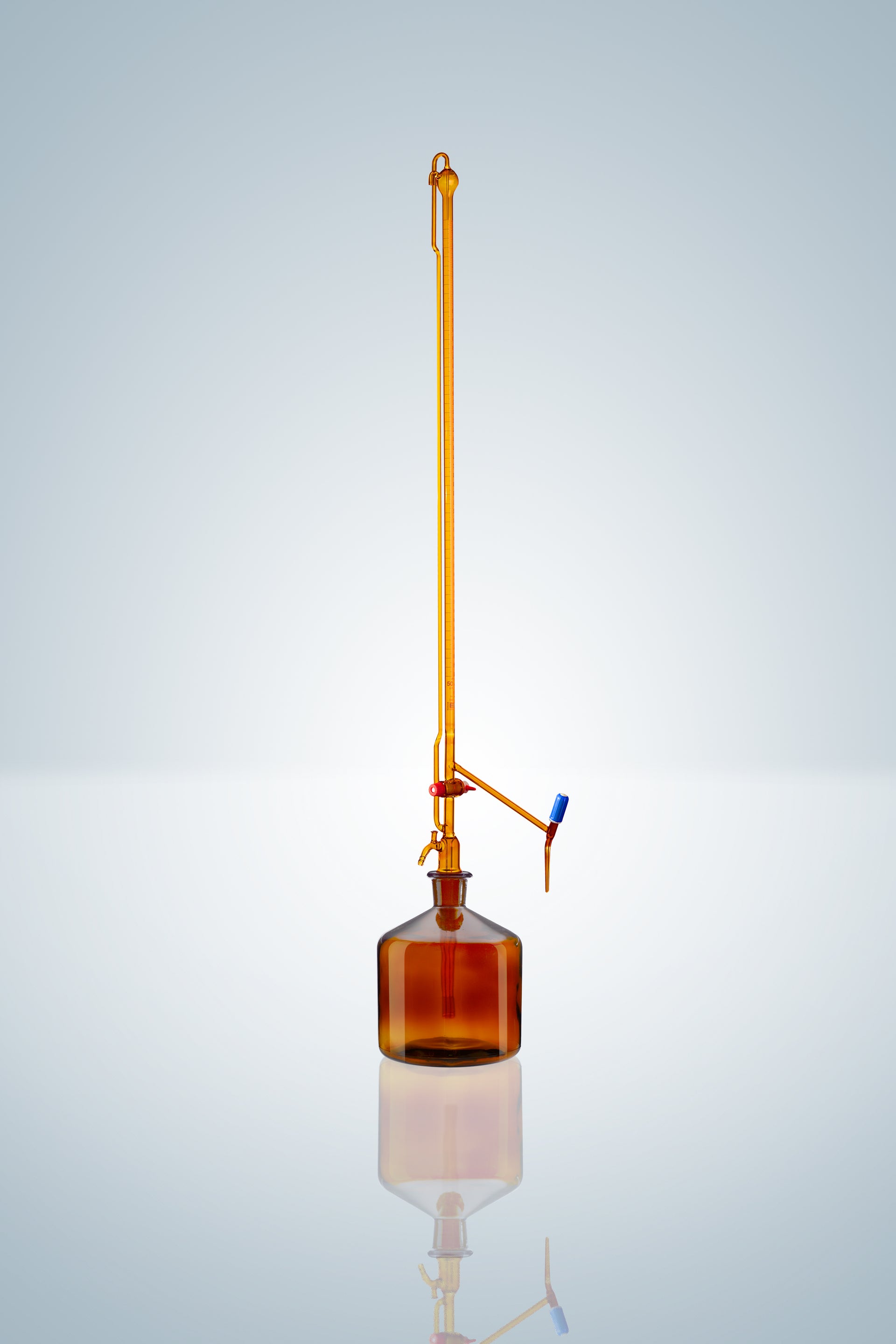 Automatic burettes DURAN®, class B white graduation, 10:0,02 ml, incl. 2000 ml bottle (amber glass), Pellet, short line, lateral stopcock with spindle of PTFE and intermediate stopcock, acc. to DIN EN ISO 385.