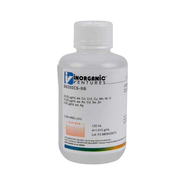 This solution may be combined with Interference check solution -Part A to give the full complement of elements listed in EPA method 6020A. Please see 6020ICS-0A, 8A and 9B for more details.