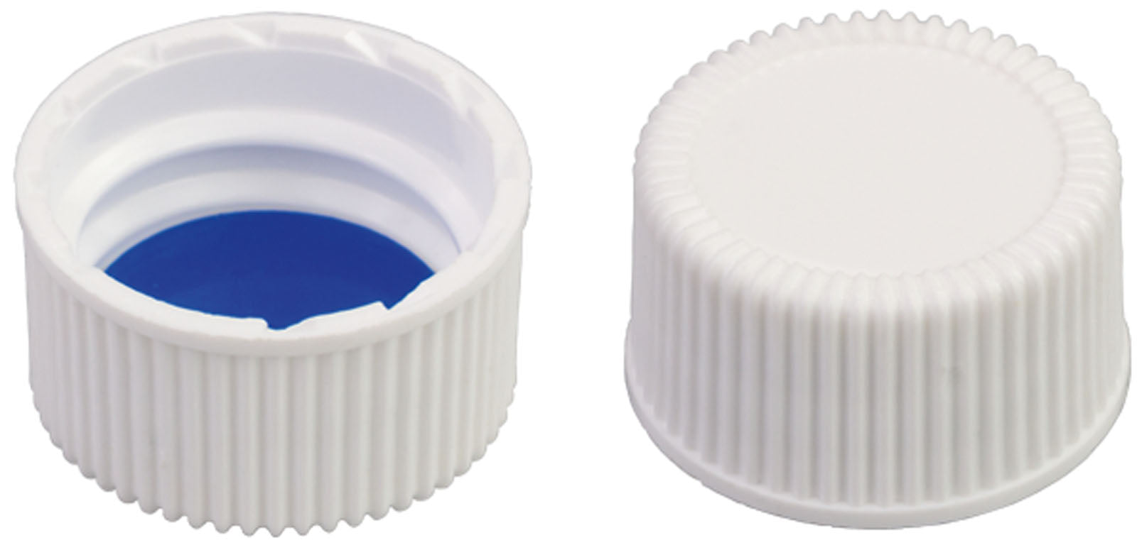 Bonded closures with a firmly integrated Silicone/PTFE septa that cannot be removed. Silicone/PTFE offers highest analytical purity and a high temperature resistance. Closed top closure used for sample storage; 702181 is used for TOC analysis on Shimadzu ASI-L/ASI-V.