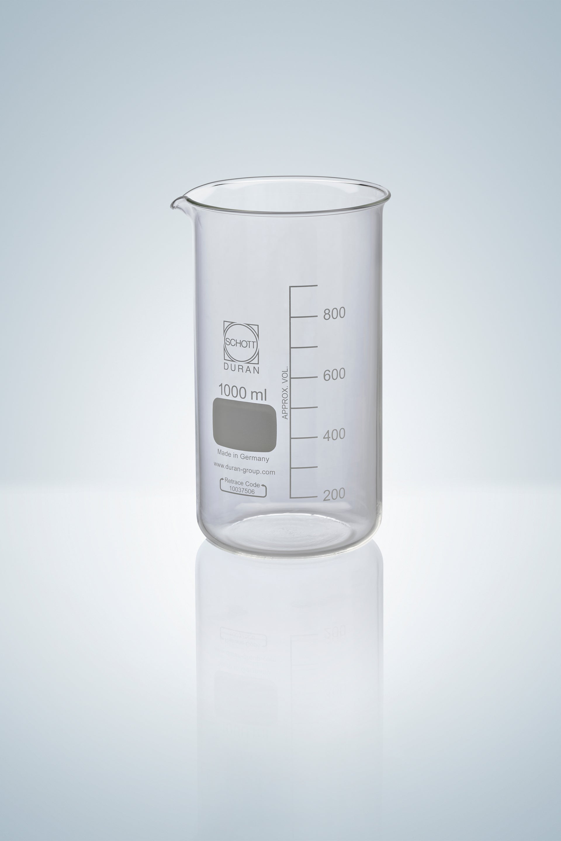 Beakers DURAN®, tall form, white graduation, 100 ml, height 80 mm, graduation and spout, outer diameter 48 mm, acc. to DIN 12 331.