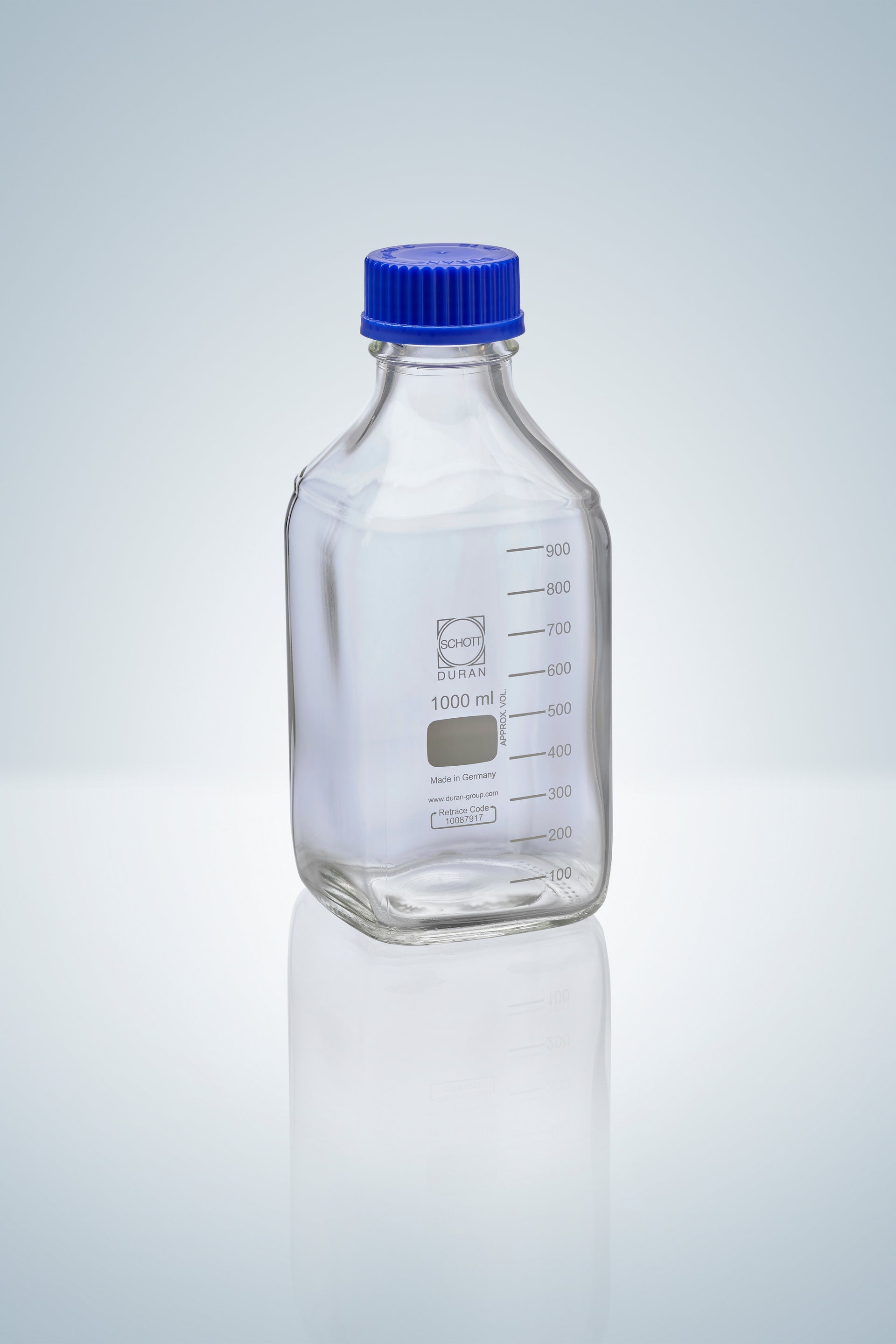 Square bottles DURAN®, GL45, 500 ml, height 181 mm, ø 78 mm, with DIN thread ISO 4796, graduated, with PP screwed cap and PP pouring ring (blue), white graduation, autoclavable.