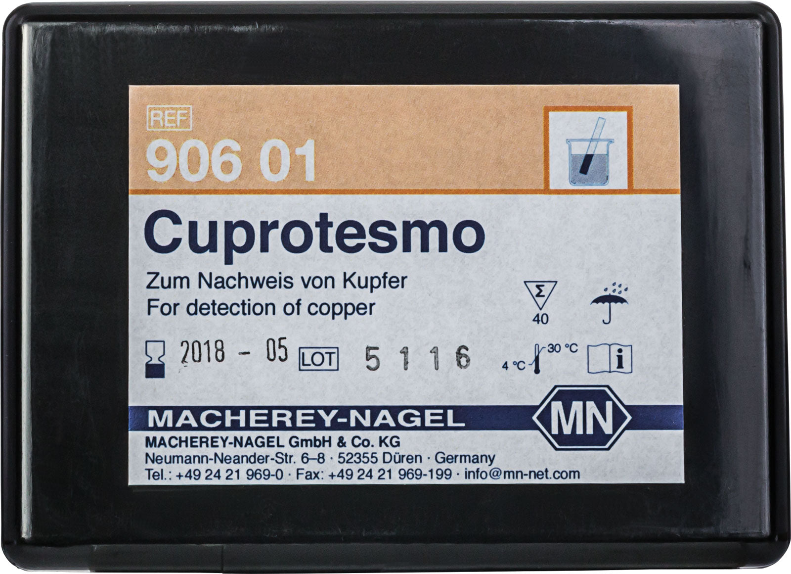 - Qualitative test paper Cuprotesmo for Copper: 0.05__g Cu on surfaces