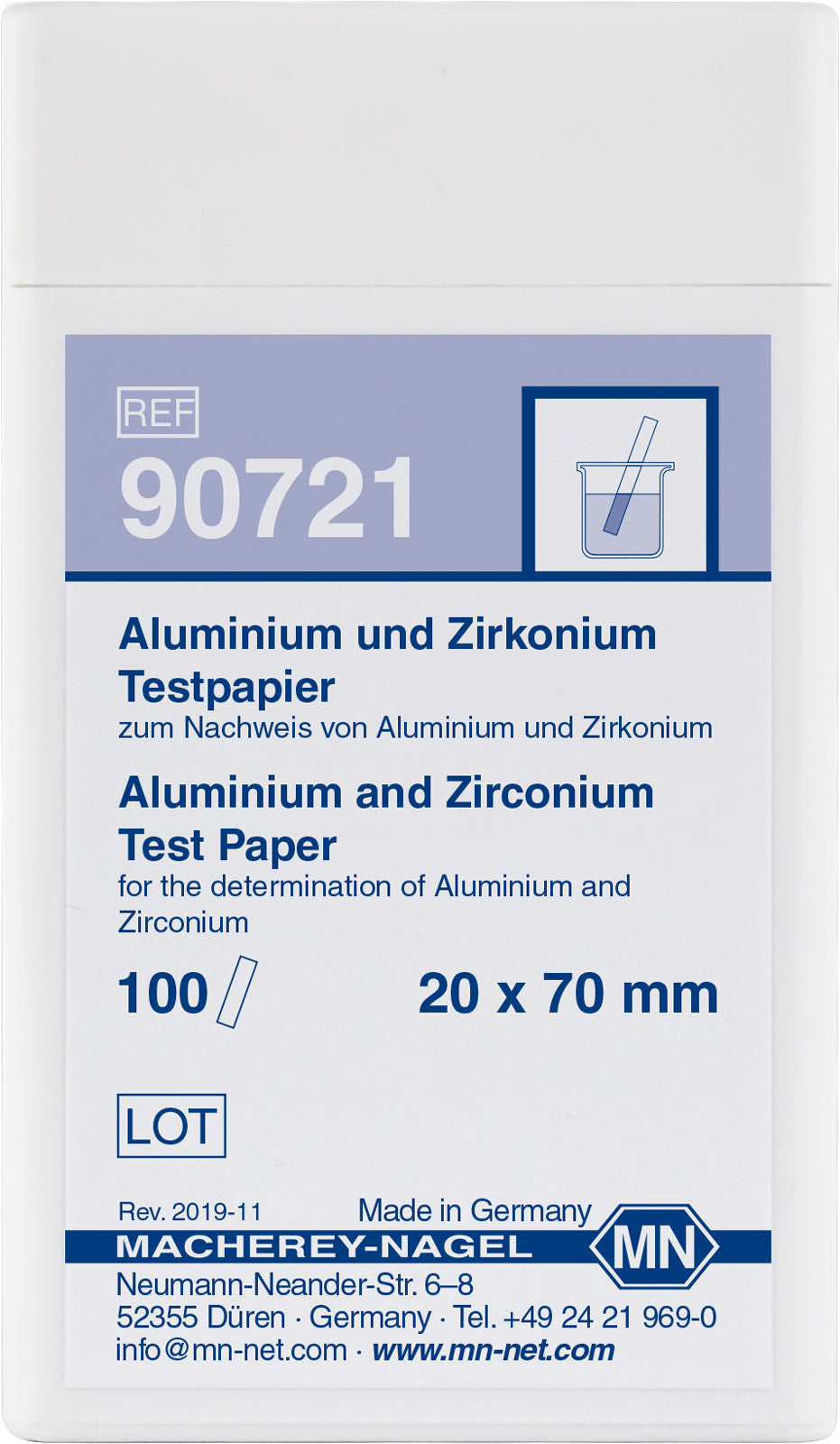 Aluminum/Zirconium test paper allows the quick and easy detection of aluminum or Zirconium. In the presence of aluminum (Al³⁺) it shows bright red spots on a yellow background. With a different method it shows a red-violet spot in the presence of Zirconium (Zr⁴⁺).