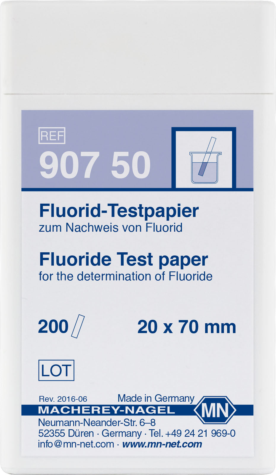 Fluoride test paper allows the rapid detection of fluoride ions in solutions containing hydrochloric acid. It is suitable for the safe and easy detection of dangerous hydrofluoric acid, which is used for example in computer chip production.