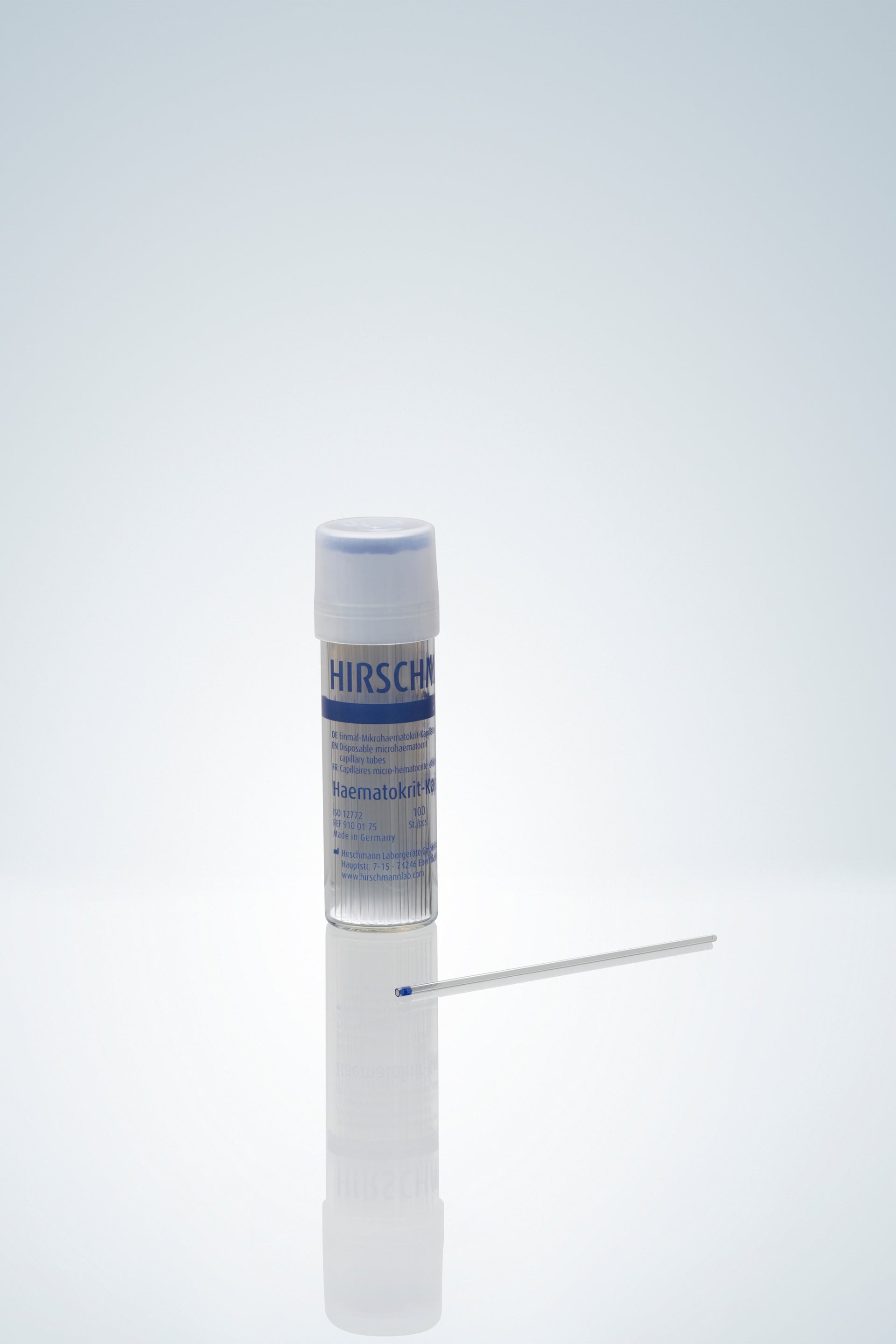 Haematocrit tubes, 75 µl, L75 mm, OD 1,42-1,68 mm, ID 1,07-1,23 mm, capillary glass disposable, not heparinized,, color-code blue, DIN EN ISO 12772, CE acc. IVD 98/79 EC.