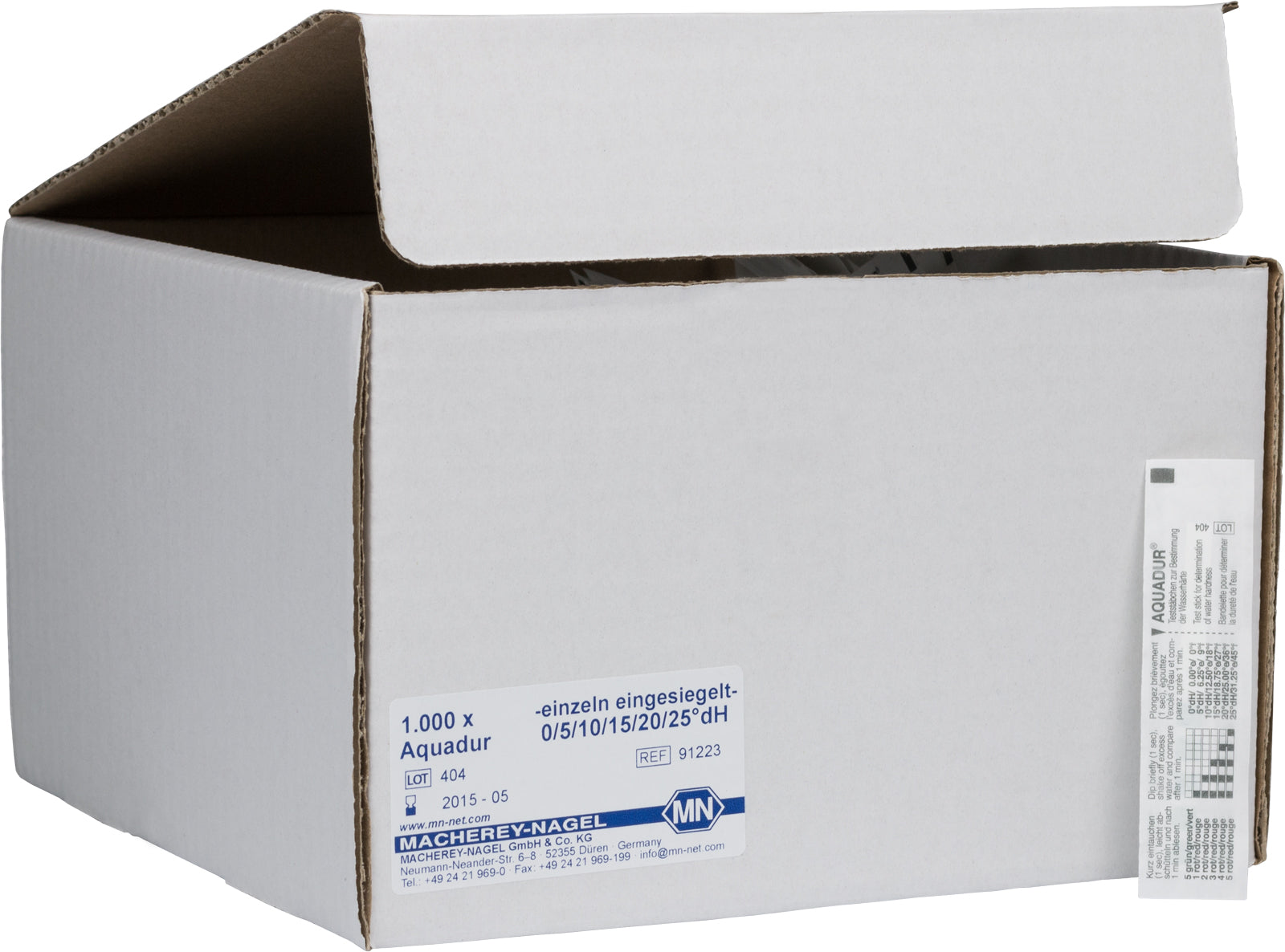 - AQUADUR 5–25, for water hardness, individually sealed, 1000 strips