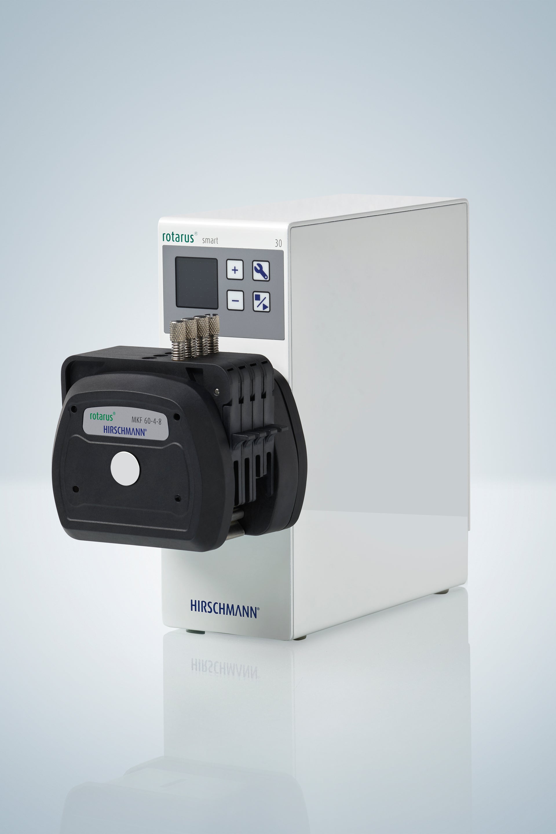 rotarus® smart 30 peristaltic pump set with pump head MKF 60-4-8, DC-motor, 10-350 1/min, IP 43, white. Precise feeding pump with economical pump head made of durable PPS plastics for simple and easy loading of the tubing. Reduction with a 2-stage planetary gearbox and thus ideal for the delivery of media with higher viscosity. Speed and the most important parameters can be programmed directly on the panel and TFT touchscreen on the housing front. Delivery includes the rotarus® smart 40 pump drive including pump head and corresponding adapter set, power supply with EU, UK, US adaptor and push-button interface.