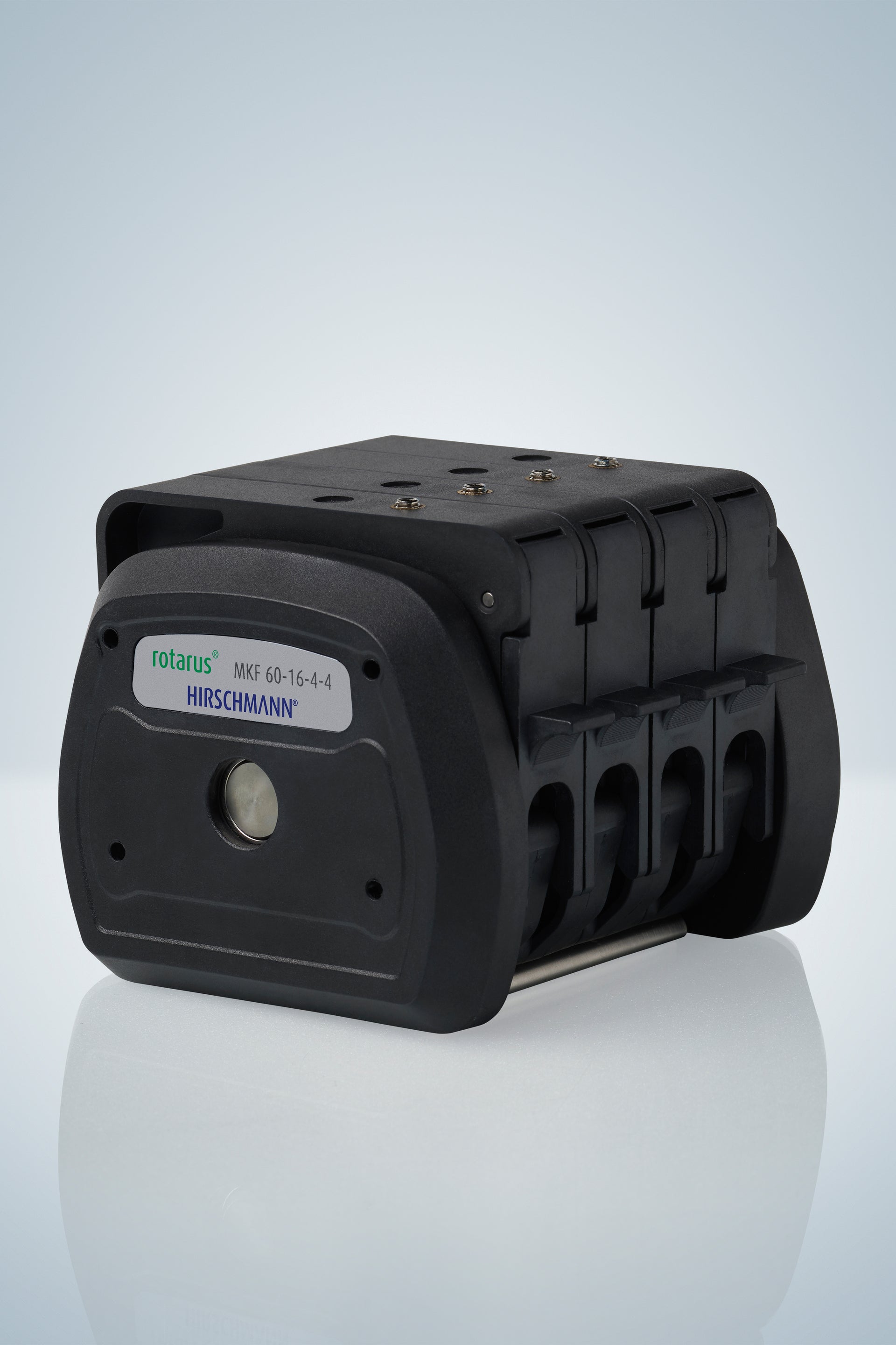 rotarus® MKF 60-16-4-4, 4-channel pump head, 4 rollers. New hybrid pump head made of durable PPS plastics for continuous feeding or precise dispensing of target volumes with sturdy tubing cassettes with built-in tubing retainer as well as fixed distance between rollers and tubing bed for the use with regular pump tubing without stoppers in a multi-channel pump head. One of the two MKF-60 adapter-sets is necessary to attach the pump head to the Hirschmann rotarus® drives.