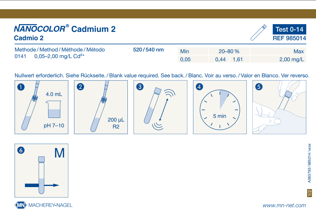 Hazardous material: No Shelf life (from production): 1 Year Brand: NANOCOLOR Storage temperature: 15−25 °C Parameter: Cadmium Remark: Measuring range on NANOCOLOR VIS II Platform: NANOCOLOR tube tests NanOx Metal: Yes NanOx N: No Sludge reagent set: No Sea water analysis: Yes Evaluable on photometer: UV/VIS II Evaluable on photometer: VIS II Evaluable on photometer: 500 D Evaluable on photometer: PF-12Plus Crack-Set: Yes Scope of delivery: Rugged box with 19 test tubes. Sufficient for 10-19 tests. Method: Cadmium - Cadion Measuring range: Cadmium - 0.05–2.00 mg/L Cd²⁺ Test No.: 0-14 -