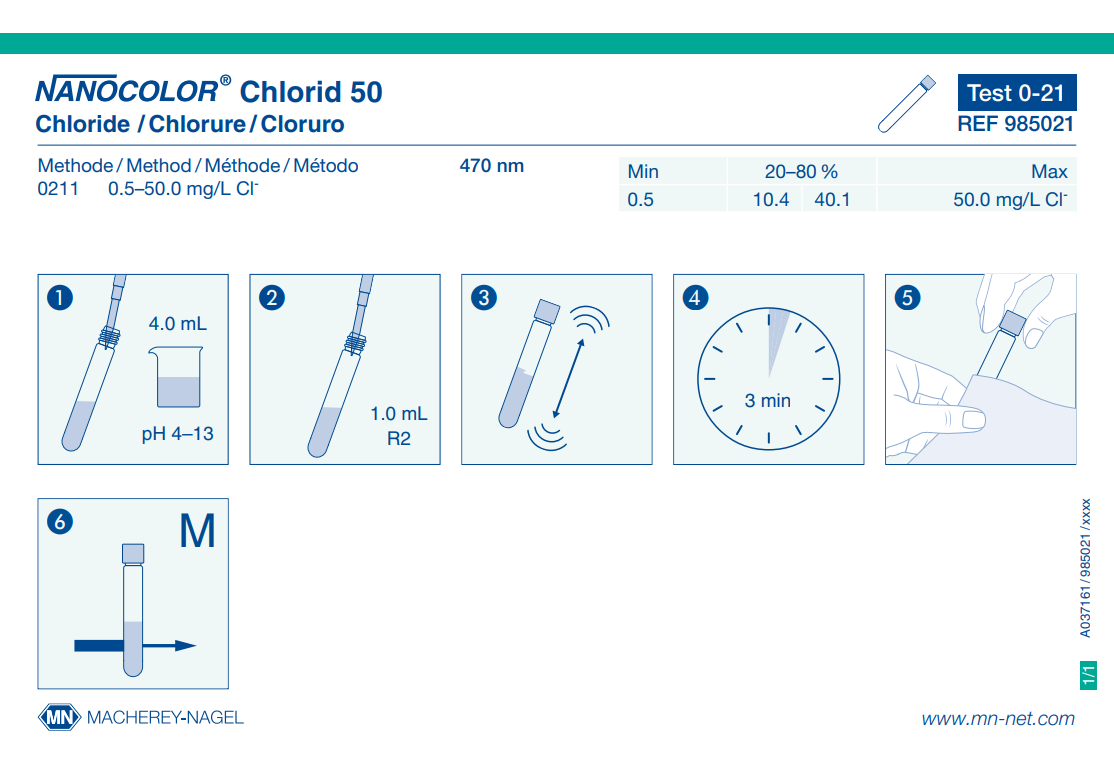 Hazardous material: Yes Shelf life (from production): 1 Year Parameter: Chloride Brand: NANOCOLOR Storage temperature: 15−25 °C Scope of delivery: Rugged box with 20 test tubes. Sufficient for 20 tests. Remark: Measuring range on NANOCOLOR VIS II Platform: NANOCOLOR tube tests NanOx N: No Crack-Set: No Sludge reagent set: No Evaluable on photometer: UV/VIS II Evaluable on photometer: VIS II Evaluable on photometer: 500 D Evaluable on photometer: PF-12Plus NanOx Metal: No Method: Chloride - Mercury(II) -thiocyanate/Iron(III) -nitrate Based on norm: Analogous to EPA 325.1, APHA 4500-Cl- E Sea water analysis: No Measuring range: Chloride - 0.5–50.0 mg/L Cl⁻ Test No.: 0-21 -