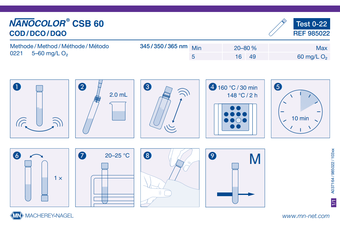 Hazardous material: Yes Shelf life (from production): 1 Year Storage temperature: 2−8 °C Brand: NANOCOLOR Parameter: COD Scope of delivery: Rugged box with 20 test tubes. Sufficient for 20 tests. Remark: Measuring range on NANOCOLOR VIS II Platform: NANOCOLOR tube tests NanOx N: No Crack-Set: No Sludge reagent set: No Evaluable on photometer: UV/VIS II Evaluable on photometer: VIS II Evaluable on photometer: 500 D Evaluable on photometer: PF-12Plus NanOx Metal: No Sea water analysis: No Method: COD - Potassium dichromate Evaluable on photometer: PF-3 COD Measuring range: COD - 5–60 mg/L O₂ Based on norm: In accordance with DIN ISO 15705 – H45, analogous to EPA 410.4, APHA 5220 D, DIN 38409 – H41-1 Test No.: 0-22 -