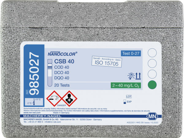 Hazardous material: Yes Shelf life (from production): 1 Year Storage temperature: 2−8 °C Brand: NANOCOLOR Parameter: COD Scope of delivery: Rugged box with 20 test tubes. Sufficient for 20 tests. Remark: Measuring range on NANOCOLOR VIS II Platform: NANOCOLOR tube tests NanOx N: No Crack-Set: No Sludge reagent set: No Evaluable on photometer: UV/VIS II Evaluable on photometer: VIS II Evaluable on photometer: 500 D Evaluable on photometer: PF-12Plus NanOx Metal: No Sea water analysis: No Method: COD - Potassium dichromate Evaluable on photometer: PF-3 COD Based on norm: In accordance with DIN ISO 15705 – H45, analogous to EPA 410.4, APHA 5220 D, DIN 38409 – H41-1 Measuring range: COD - 2–40 mg/L O₂ Test No.: 0-27 -