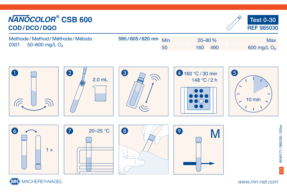 Hazardous material: Yes Shelf life (from production): 1 Year Brand: NANOCOLOR Storage temperature: 15−25 °C Parameter: COD Scope of delivery: Rugged box with 20 test tubes. Sufficient for 20 tests. Remark: Measuring range on NANOCOLOR VIS II Platform: NANOCOLOR tube tests NanOx N: No Crack-Set: No Sludge reagent set: No Evaluable on photometer: UV/VIS II Evaluable on photometer: VIS II Evaluable on photometer: 500 D Evaluable on photometer: PF-12Plus NanOx Metal: No Sea water analysis: No Method: COD - Potassium dichromate Evaluable on photometer: PF-3 COD Measuring range: COD - 50–600 mg/L O₂ Based on norm: In accordance with DIN ISO 15705 – H45, analogous to EPA 410.4, Test No.: 0-30 -