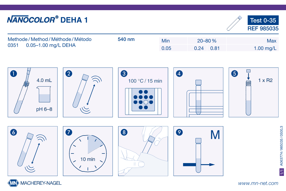 Hazardous material: Yes Shelf life (from production): 1 Year Brand: NANOCOLOR Storage temperature: 15−25 °C Scope of delivery: Rugged box with 20 test tubes. Sufficient for 20 tests. Remark: Measuring range on NANOCOLOR VIS II Platform: NANOCOLOR tube tests NanOx N: No Crack-Set: No Sludge reagent set: No Sea water analysis: Yes Evaluable on photometer: UV/VIS II Evaluable on photometer: VIS II Evaluable on photometer: 500 D Evaluable on photometer: PF-12Plus NanOx Metal: No Parameter: DEHA Method: DEHA - Redox reaction Measuring range: DEHA - 0.05–1.00 mg/L DEHA Test No.: 0-35 -