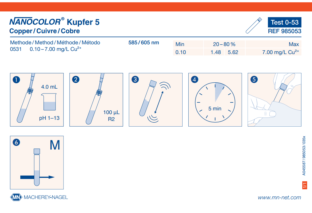 Hazardous material: No Shelf life (from production): 2 Years Parameter: Copper Brand: NANOCOLOR Storage temperature: 15−25 °C Scope of delivery: Rugged box with 20 test tubes. Sufficient for 20 tests. Remark: Measuring range on NANOCOLOR VIS II Platform: NANOCOLOR tube tests NanOx Metal: Yes NanOx N: No Sludge reagent set: No Sea water analysis: Yes Evaluable on photometer: UV/VIS II Evaluable on photometer: VIS II Evaluable on photometer: 500 D Evaluable on photometer: PF-12Plus Crack-Set: Yes Method: Copper - Cuprizone Measuring range: Copper - 0.10–7.00 mg/L Cu²⁺ Test No.: 0-53 -