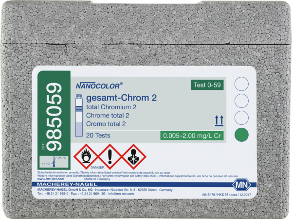 Hazardous material: Yes Shelf life (from production): 2 Years Brand: NANOCOLOR Storage temperature: 15−25 °C Scope of delivery: Rugged box with 20 test tubes. Sufficient for 20 tests. Remark: Measuring range on NANOCOLOR VIS II Platform: NANOCOLOR tube tests NanOx N: No Crack-Set: No Sludge reagent set: No Evaluable on photometer: UV/VIS II Evaluable on photometer: VIS II Evaluable on photometer: 500 D Evaluable on photometer: PF-12Plus NanOx Metal: No Sea water analysis: No Parameter: Chrome / Chromate Method: Chrome - Carbazide Measuring range: Chrome - 0.05–2.00 mg/L Cr Measuring range sensitive: Chrome - 0.005–0.500 mg/L Cr Based on norm: Analogous APHA 3500-Cr D , DIN 38405 – D24 Test No.: 0-59 -