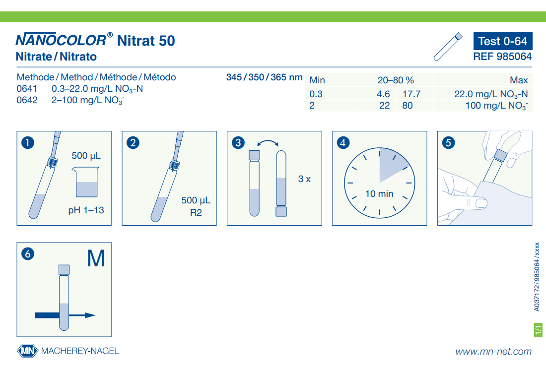Hazardous material: Yes Shelf life (from production): 2 Years Parameter: Nitrate Brand: NANOCOLOR Storage temperature: 15−25 °C Scope of delivery: Rugged box with 20 test tubes. Sufficient for 20 tests. Remark: Measuring range on NANOCOLOR VIS II Platform: NANOCOLOR tube tests NanOx N: No Crack-Set: No Sludge reagent set: No Evaluable on photometer: UV/VIS II Evaluable on photometer: VIS II Evaluable on photometer: 500 D Evaluable on photometer: PF-12Plus Evaluable on photometer: PF-3 Soil NanOx Metal: No Sea water analysis: No Method: Nitrate - 2,6 -Dimethylphenol Measuring range: Nitrate - 0.3–22.0 mg/L NO₃-N Measuring range 2: Nitrate - 2–100 mg/L NO₃⁻ Based on norm: Analogous to ISO 7890-1, DIN 38405 – D9 Test No.: 0-64 -