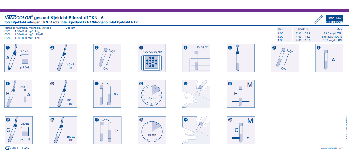 Hazardous material: Yes Shelf life (from production): 1.5 Years Brand: NANOCOLOR Storage temperature: 15−25 °C Parameter: Kjeldahl Nitrogen Remark: Measuring range on NANOCOLOR VIS II Platform: NANOCOLOR tube tests Crack-Set: No Sludge reagent set: No Evaluable on photometer: UV/VIS II Evaluable on photometer: VIS II Evaluable on photometer: 500 D Evaluable on photometer: PF-12Plus NanOx Metal: No Evaluable on photometer: VIS Sea water analysis: No NanOx N: Yes Scope of delivery: 3 rugged boxes with 60 test tubes. Sufficient for 20 tests. Method: Kjeldahl Nitrogen - 2,6 Dimethylphenol Measuring range: Kjeldahl-Nitrogen - 1.00–16.0 mg/L TKN Test No.: 0-67 -