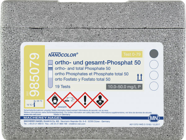 Hazardous material: Yes Shelf life (from production): 3 Years Parameter: Phosphate Brand: NANOCOLOR Storage temperature: 15−25 °C Remark: Measuring range on NANOCOLOR VIS II Platform: NANOCOLOR tube tests NanOx Metal: Yes NanOx N: No Crack-Set: No Sludge reagent set: No Sea water analysis: Yes Evaluable on photometer: UV/VIS II Evaluable on photometer: VIS II Evaluable on photometer: 500 D Evaluable on photometer: PF-12Plus Scope of delivery: Rugged box with 19 test tubes. Sufficient for 19 tests. Method: Phosphate - Vanadate molybdate Measuring range: Phosphate - 10.0–50.0 mg/L P Measuring range 2: Phosphate - 30–150 mg/L PO₄³⁻ Based on norm: Analogous to APHA 4500-P C Test No.: 0-79 -