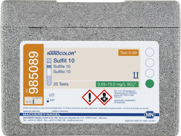 Hazardous material: Yes Shelf life (from production): 1 Year Parameter: Sulfite Brand: NANOCOLOR Storage temperature: 15−25 °C Scope of delivery: Rugged box with 20 test tubes. Sufficient for 20 tests. Remark: Measuring range on NANOCOLOR VIS II Platform: NANOCOLOR tube tests NanOx N: No Crack-Set: No Sludge reagent set: No Sea water analysis: Yes Evaluable on photometer: UV/VIS II Evaluable on photometer: VIS II Evaluable on photometer: 500 D Evaluable on photometer: PF-12Plus NanOx Metal: No Method: Sulfite - Thiobenzoic acid derivative Measuring range: Sulfite - 0.2–10.0 mg/L SO₃²⁻ Measuring range sensitive: Sulfite - 0.05–2.40 mg/L SO₃²⁻ Test No.: 0-89  -