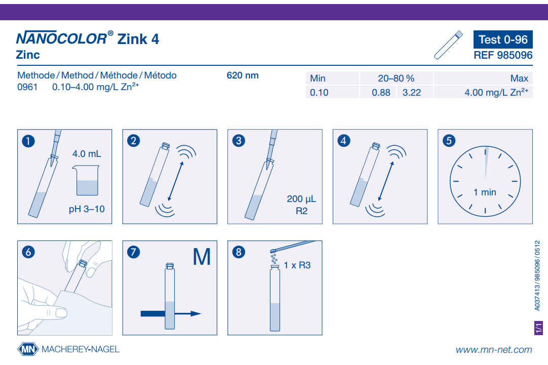 Hazardous material: Yes Shelf life (from production): 1 Year Parameter: Zinc Brand: NANOCOLOR Storage temperature: 15−25 °C Scope of delivery: Rugged box with 20 test tubes. Sufficient for 20 tests. Remark: Measuring range on NANOCOLOR VIS II Platform: NANOCOLOR tube tests NanOx Metal: Yes NanOx N: No Sludge reagent set: No Sea water analysis: Yes Evaluable on photometer: UV/VIS II Evaluable on photometer: VIS II Evaluable on photometer: 500 D Evaluable on photometer: PF-12Plus Crack-Set: Yes Method: Zinc - Zincon Measuring range: Zinc - 0.10–4.00 mg/L Zn²⁺ Based on norm: Analogous APHA 3500-Zn F Test No.: 0-96 -