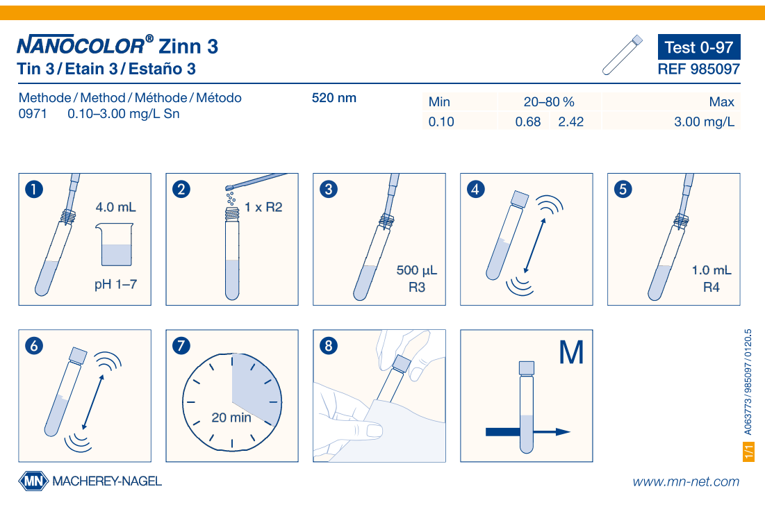 Hazardous material: Yes Shelf life (from production): 1 Year Parameter: Tin Brand: NANOCOLOR Storage temperature: 15−25 °C Remark: Measuring range on NANOCOLOR VIS II Platform: NANOCOLOR tube tests NanOx N: No Crack-Set: No Sludge reagent set: No Sea water analysis: Yes Evaluable on photometer: UV/VIS II Evaluable on photometer: VIS II Evaluable on photometer: 500 D Evaluable on photometer: PF-12Plus NanOx Metal: No Scope of delivery: Rugged box with 18 test tubes. Sufficient for 18 tests. Method: Tin - 9 -Phenyl -3 -fluoron Measuring range: Tin - 0.10–3.00 mg/L Sn Test No.: 0-97 -