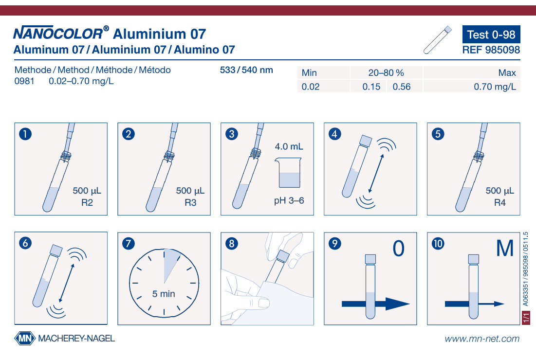 Hazardous material: No Shelf life (from production): 1 Year Parameter: Aluminum Brand: NANOCOLOR Storage temperature: 15−25 °C Remark: Measuring range on NANOCOLOR VIS II Platform: NANOCOLOR tube tests NanOx Metal: Yes NanOx N: No Crack-Set: No Sludge reagent set: No Sea water analysis: Yes Evaluable on photometer: UV/VIS II Evaluable on photometer: VIS II Evaluable on photometer: 500 D Evaluable on photometer: PF-12Plus Scope of delivery: Rugged box with 19 test tubes. Sufficient for 19 tests. Method: Aluminum - Eriochrome Cyanine R Measuring range: Aluminum - 0.02–0.70 mg/L Al³⁺ Based on norm: Analogous to APHA 3500-Al D Test No.: 0-98 -